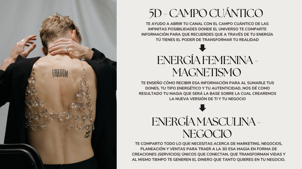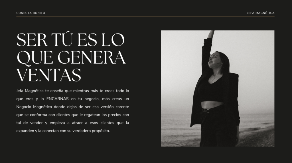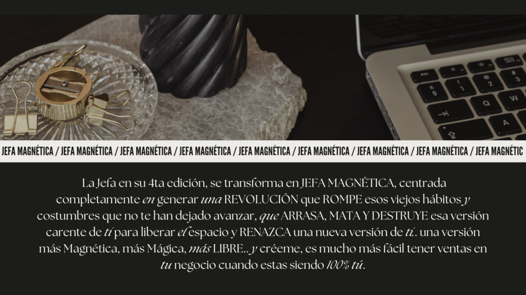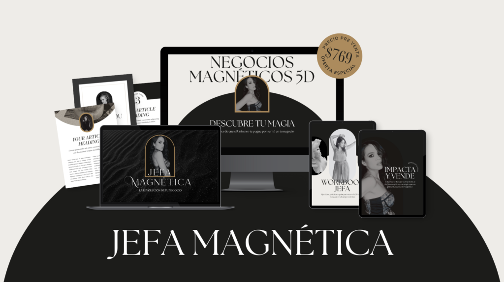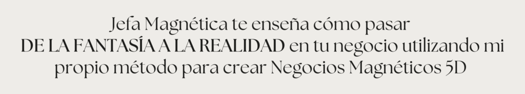Jefa Magnética es el programa de mentoría grupal que te llevará de vivir en la fantasía de todo lo que siempre has querido lograr en tu negocio pero al final terminar en el mismo lugar de siempre, a por fin tomar acción para conquistar una nueva realidad y CREAR TU PROPIO IMPERIO BASADO EN TU VERDAD.. en tu propia Magia.