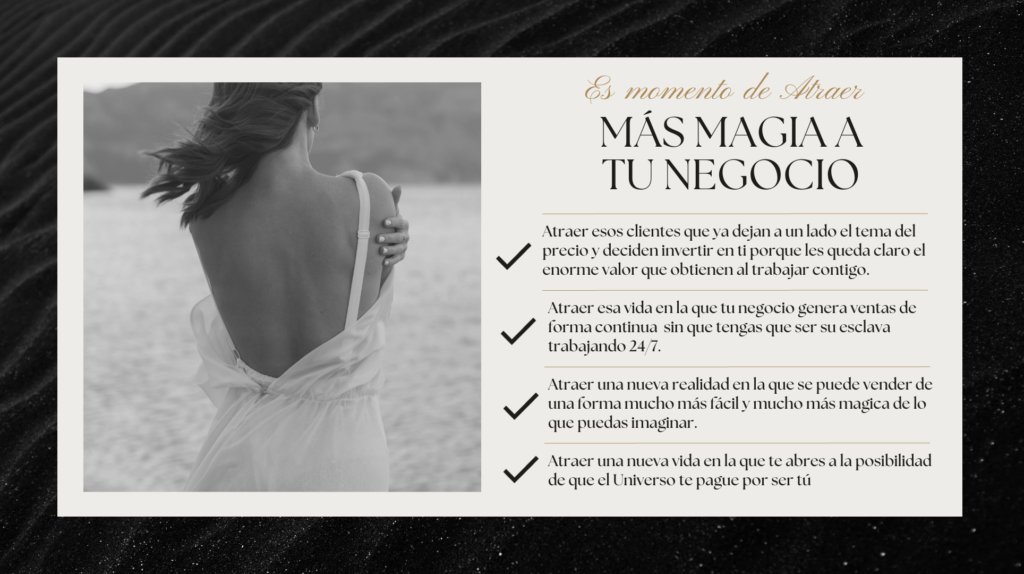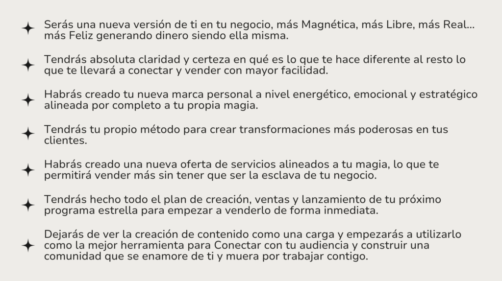 La metodología que te compartiré es la que he implementado yo misma en mi negocio en el último año y medio y me ha permitido pasar de hacer lo mismo que todo el mundo y generar poquitas ventas a crear un negocio único y alineado por completo a quien soy generando más ventas que antes y trabajando mucho menos.