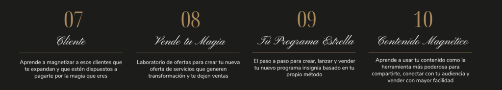 5 – Acceso al Reto de 10 días Impacta y Vende en el que juntas trabajaremos en todo lo que necesites para el lanzamiento de tu programa estrella.
